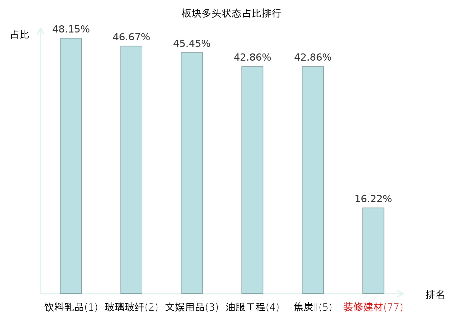 全市场所有行业板块中主力多头状态占比排名中,饮料乳品板块位居第一。商用车板块名次提升最快,较昨日上升77位。