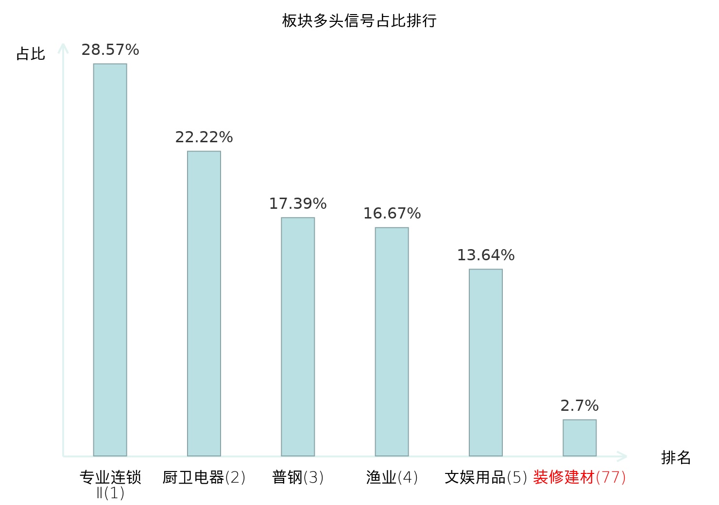 全市场所有行业板块中主力多头信号占比排名中,专业连锁Ⅱ板块位居第一。专业连锁Ⅱ板块名次提升最快,较昨日上升120位。