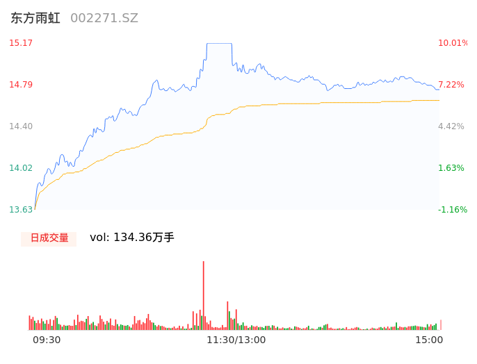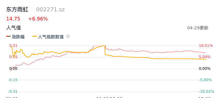 04月29日,东方雨虹收报14.75,股价涨幅6.96%,成交金额19.67亿元,换手率6.73%。