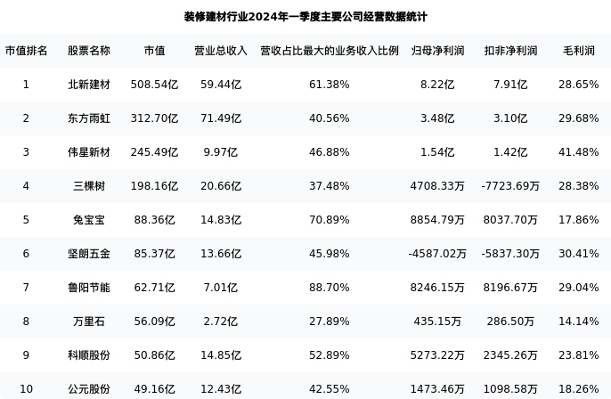 东方雨虹最新报告期数据为一季度,下表汇总了装修建材行业内市值靠前的公司一季度主要经营数据