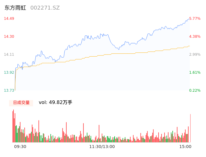04月17日,东方雨虹收报14.49,股价涨幅5.77%,成交金额7.08亿元,换手率2.50%。