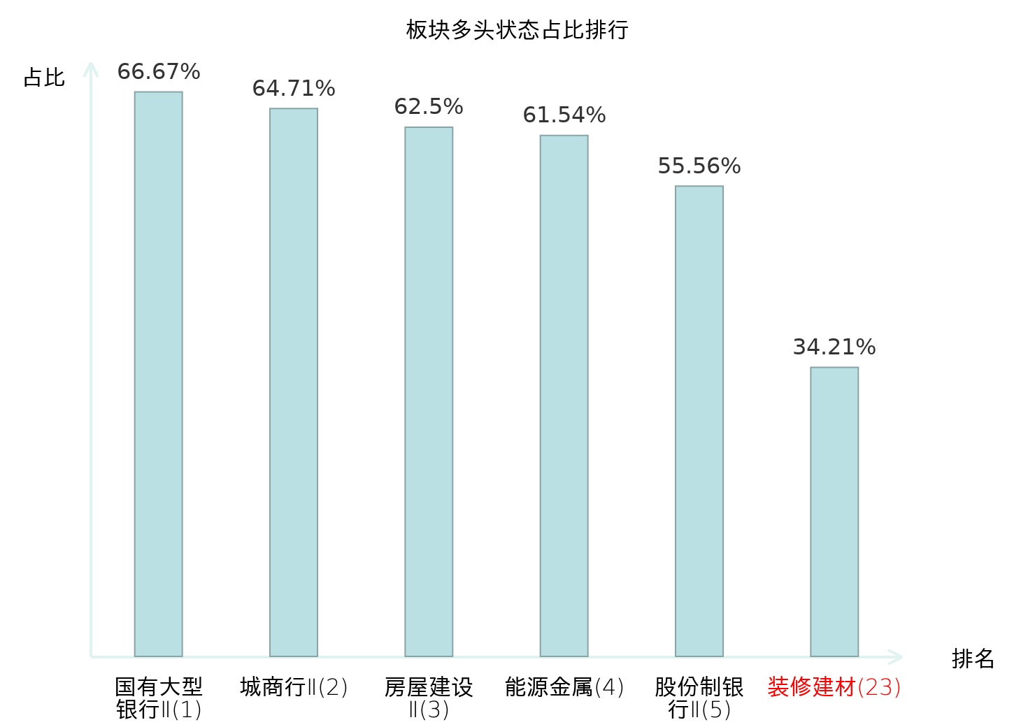 全市场所有行业板块中主力多头状态占比排名中,国有大型银行Ⅱ板块位居第一。普钢板块名次提升最快,较昨日上升65位。