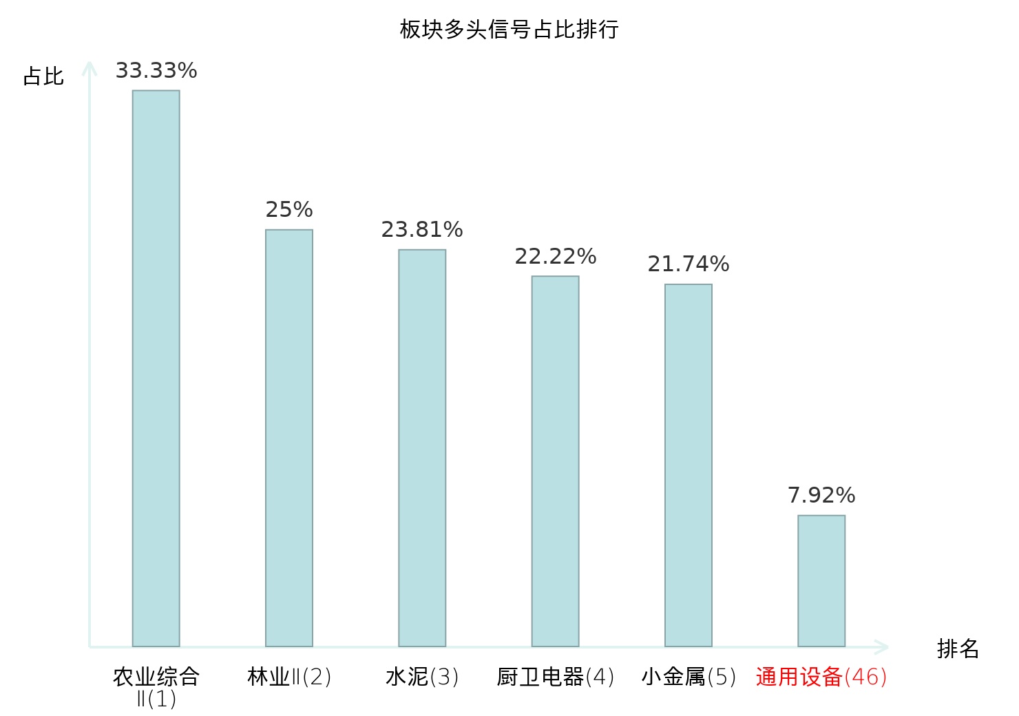 全市场所有行业板块中主力多头信号占比排名中,农业综合Ⅱ板块位居第一。农业综合Ⅱ板块名次提升最快,较昨日上升127位。