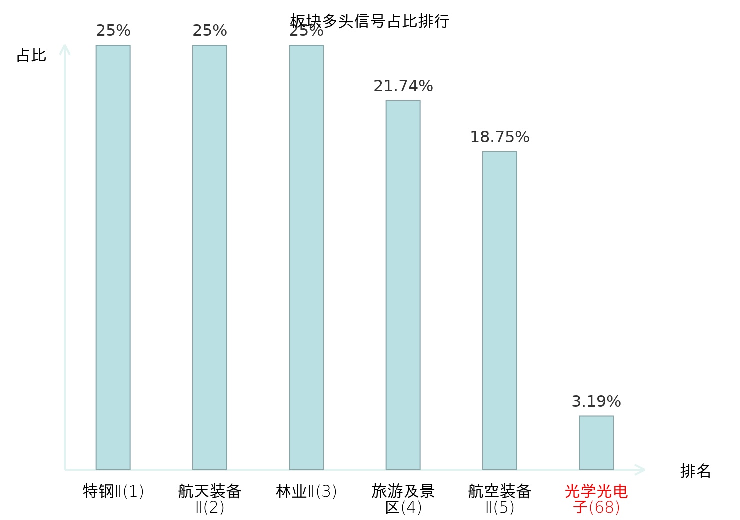 全市场所有行业板块中主力多头信号占比排名中,特钢Ⅱ板块位居第一。林业Ⅱ板块名次提升最快,较昨日上升122位。