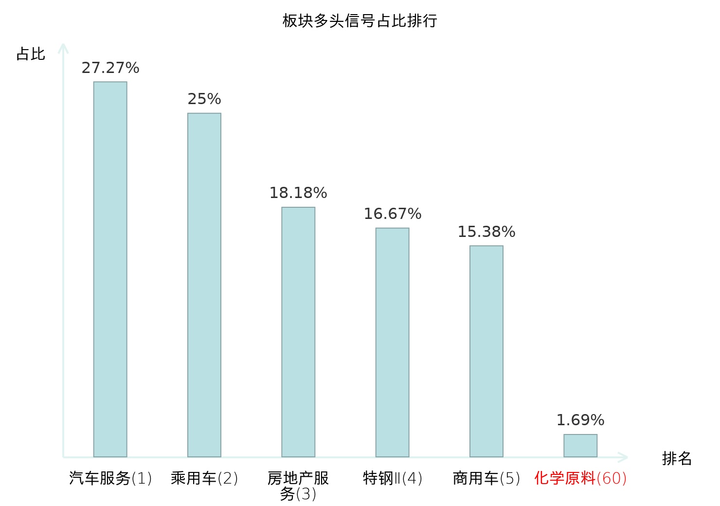 全市场所有行业板块中主力多头信号占比排名中,汽车服务板块位居第一。乘用车板块名次提升最快,较昨日上升117位。
