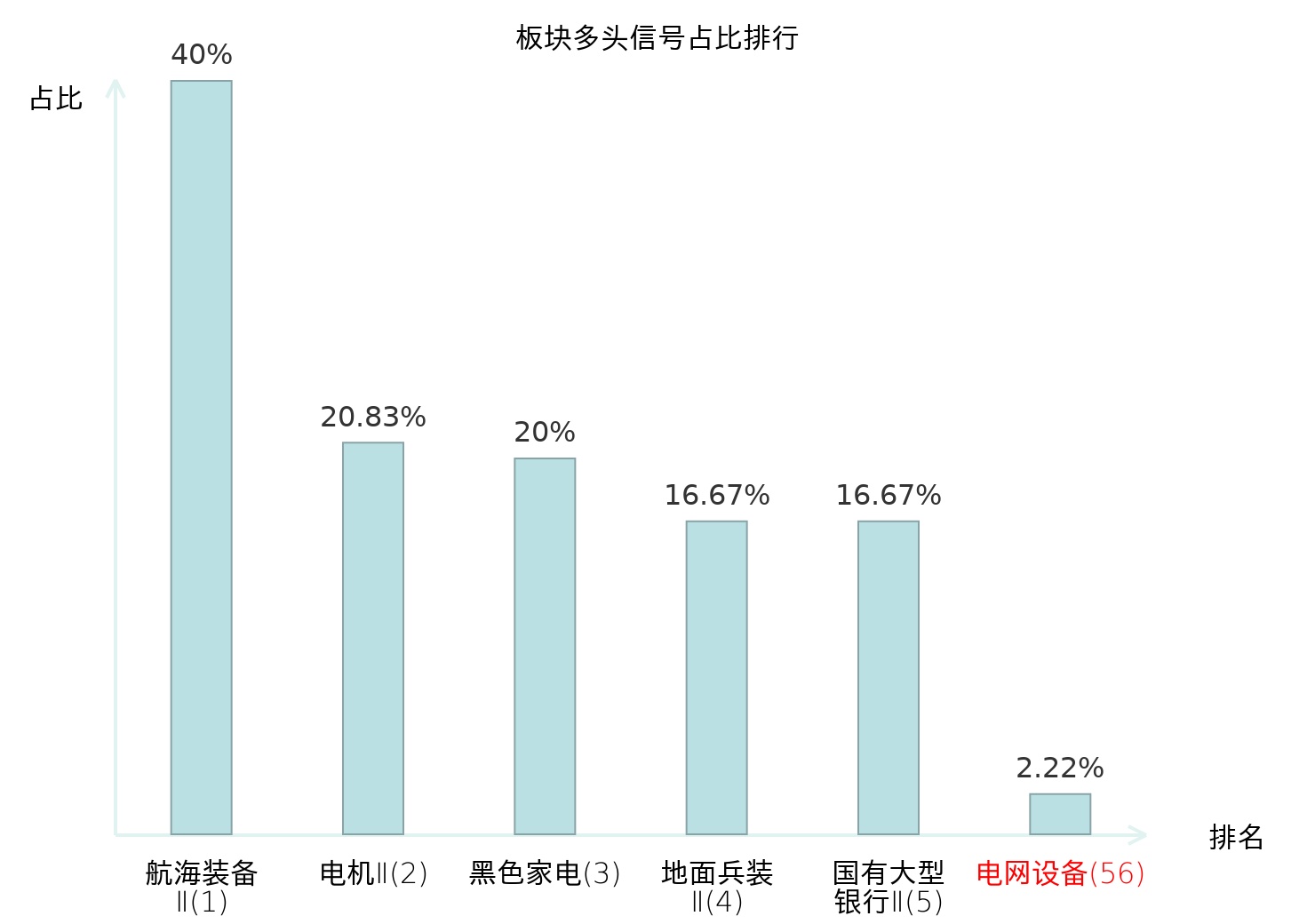 全市场所有行业板块中主力多头信号占比排名中,航海装备Ⅱ板块位居第一。国有大型银行Ⅱ板块名次提升最快,较昨日上升119位。