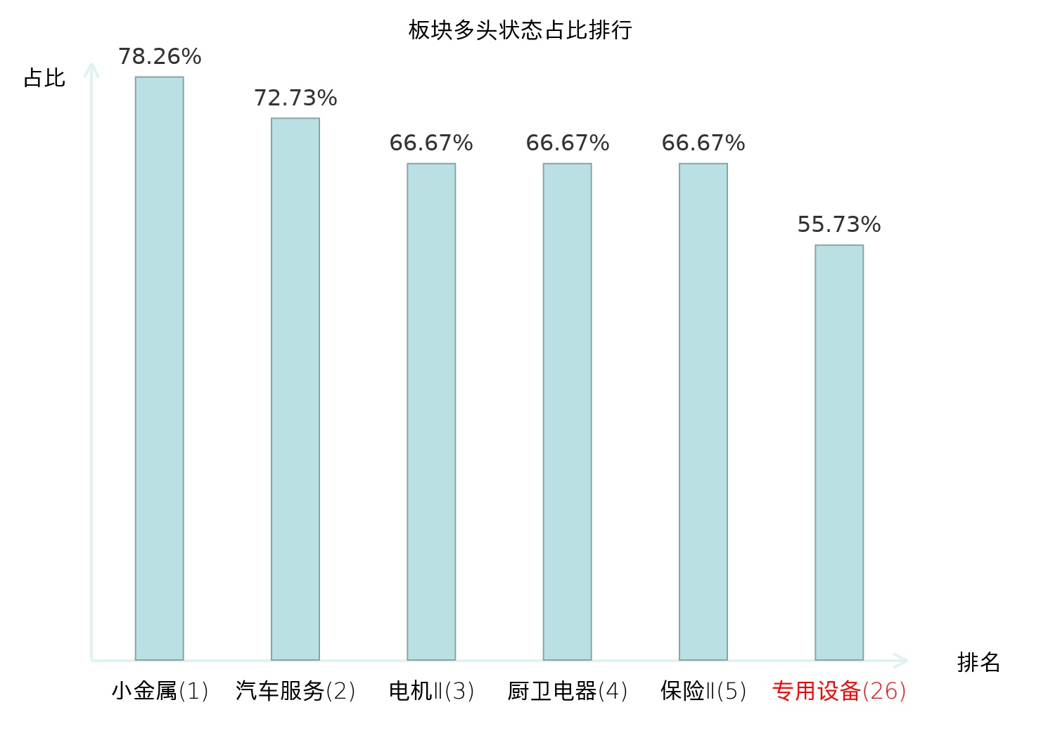 全市场所有行业板块中主力多头状态占比排名中,小金属板块位居第一。农业综合Ⅱ板块名次提升最快,较昨日上升88位。