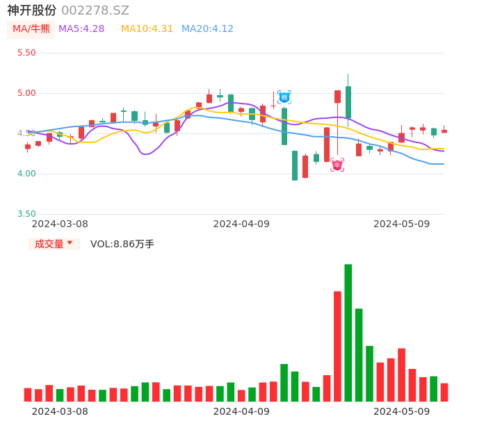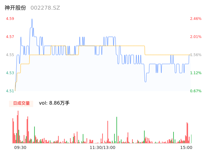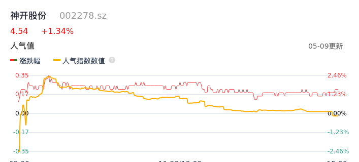 05月09日,神开股份收报4.54,股价涨幅1.34%,成交金额4033.19万元,换手率2.61%。