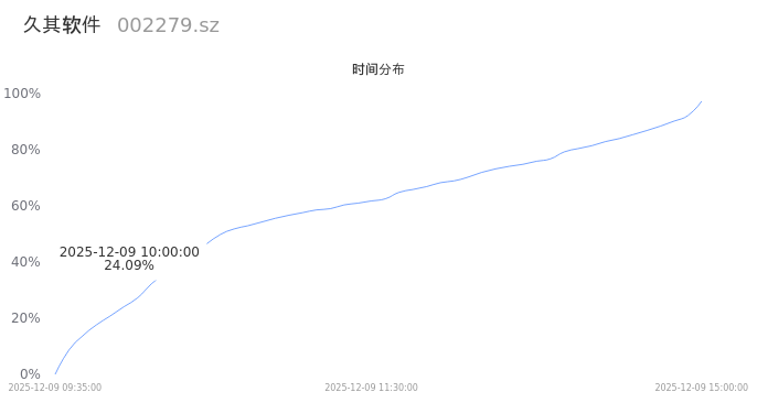 002279久其软件2025年12月09日成交70.66万手,成交金额6.00亿,相较昨日缩量24.73万手,换手率8.95%,成交清淡。
