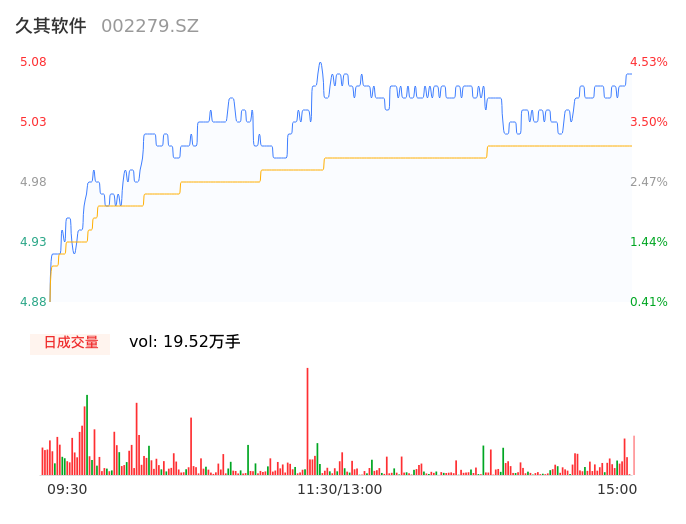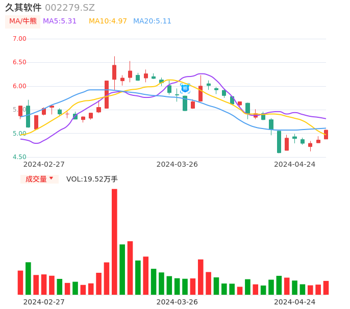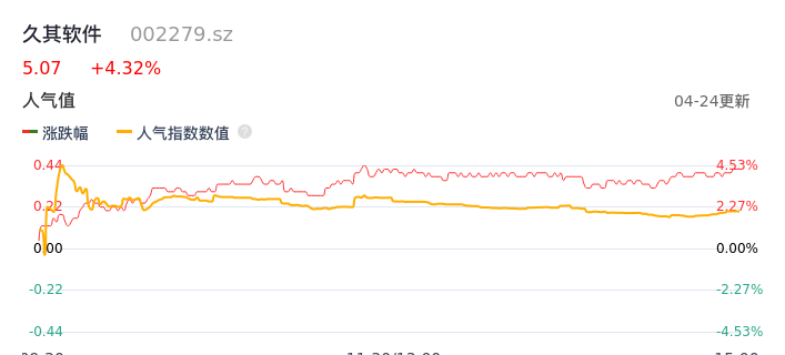 04月24日,久其软件收报5.07,股价涨幅4.32%,成交金额9784.33万元,换手率2.45%。