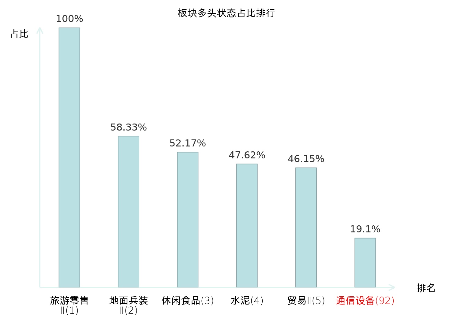 全市场所有行业板块中主力多头状态占比排名中,旅游零售Ⅱ板块位居第一。焦炭Ⅱ板块名次提升最快,较昨日上升82位。