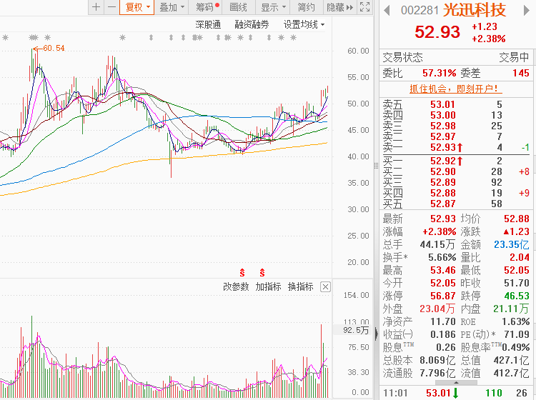 光迅科技身兼“数据中心液冷、CPO光电通信、国产芯片”等多个热点概念于一身,近1年股价随智算中心和数据通信互联等需求的井喷顺势上升(优于大市),阶段性底部逐步抬高,当前股价和估值对比业绩预期仍处于低估区间,后市增长空间巨大,十大流通股东中有多家社保、养老基金,险资和公私募机构的身影,深受游资和主力的喜爱,技术面上,近期放量突破,股价站稳在各均线之上,然后在新平台震荡整理,量价关系健康(涨放量,跌缩量),技术面上金叉信号(5日MACD和10日MACD)已显现,配合业绩预增和题材热点,以及美股对应标的大涨的催化,股价有望进一步加速。