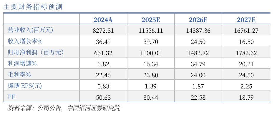 公司目前是国内少数对光芯片具备战略研发能力的厂商,年产能非常可观,低速光芯片自给率较高,是国内少数量产25G以下DFB芯片的厂商,并持续突破100G和200G光芯片等高端产品。银河证券预计公司2025-2027年整体营业收入分别为115.56/143.87/167.61亿元,同比增速39.70%/24.50%/16.50%。归母净利润分别为11.00/14.83/17.82亿元,同比增速66.34%/34.79%/20.21%,EPS分别为1.39/1.87/2.25元,对应市盈率分别为30.44/22.58/18.79倍,维持对公司的“推荐”评级。