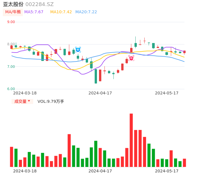 05月17日,亚太股份收报7.71,股价涨幅1.31%,成交金额7480.40万元,换手率1.34%。