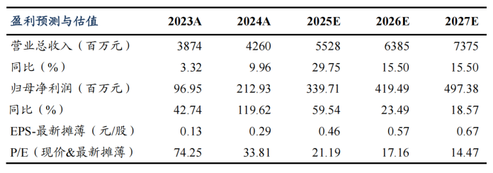 由于公司毛利率持续提升,东吴证券维持公司2025-2026年营收预测为55/64亿元,预计2027年营收为74亿元,同比分别+30%/+16%/+16%;上调2025-2026年归母净利润3.4/4.2亿元(原为2.4/2.8亿元),预计2027年归母净利润5.0亿元,同比分别+60%/+23%/+19%,对应PE分别为21/17/14倍,维持“买入”评级。