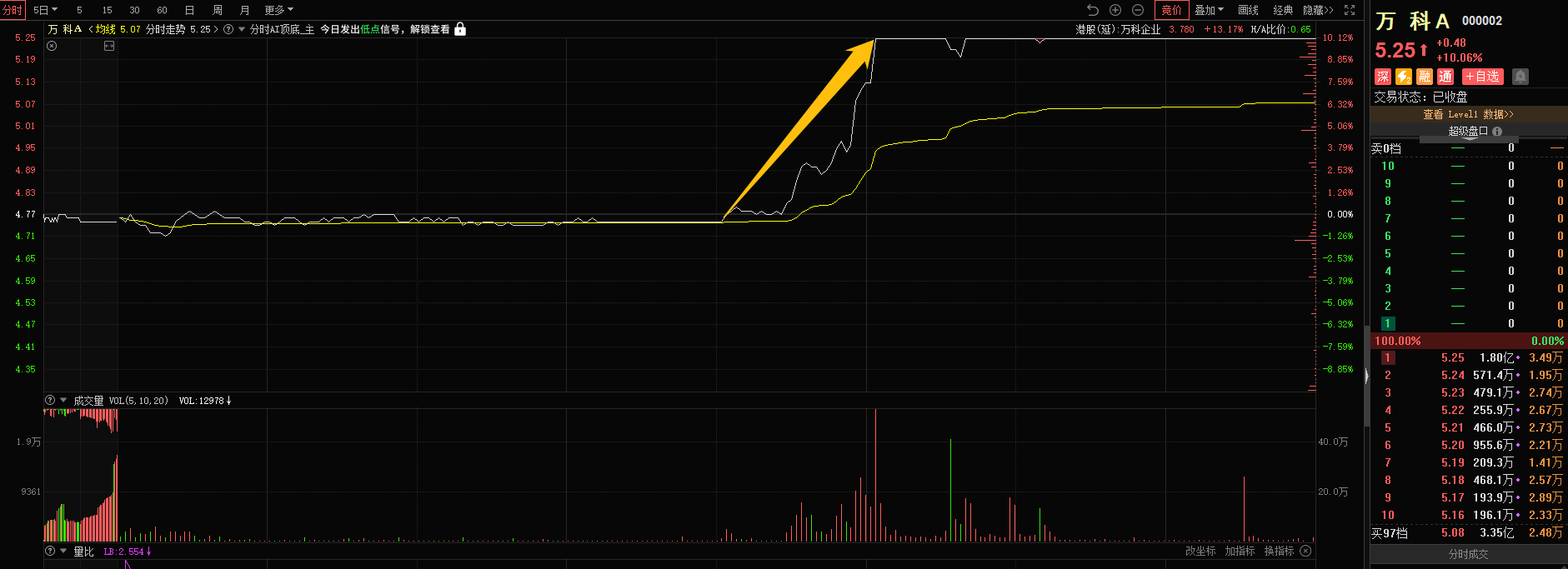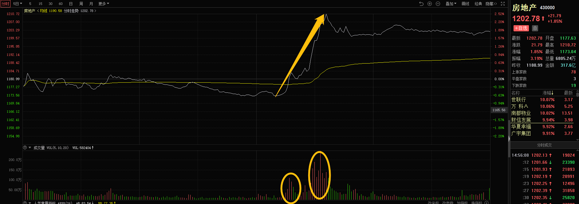 除此之外,下午房地产突发异动拉升,也是指数回暖的关键可以看到地产启动的时候,指数拐头。房地产这波是有明显的资金放量的。世联行直线拉升触及涨停,而上午的时候广宇集团就已经先涨停,华夏幸福、万科A财信发展也都在随后涨停、金地集团、金融街、中国武夷荣盛发展跟涨。