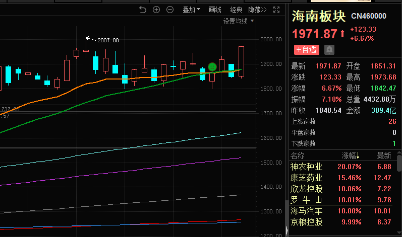 海南板块上午就已经有明显的异动,下午一上来又是一波放量的买入。全天近10股涨停,涨幅排名第一的神农种业,一根放量反包的大阳线直接吃掉前期1121日的长上引线的压力。率先涨停的是罗牛山,其次海南高速海南板块的异动主要受消息面上,今日《中共海南省委关于制定国民经济和社会发展第十五个五年规划的建议》发布。和即将在18号封关的消息刺激影响。但要注意今天海南板块的个股全部是首板,更像是量化的平铺,因此明天要注意竞价是否有出现二板的领涨股带动,否则如果没有晋级的就要担心潜在的资金兑现了。