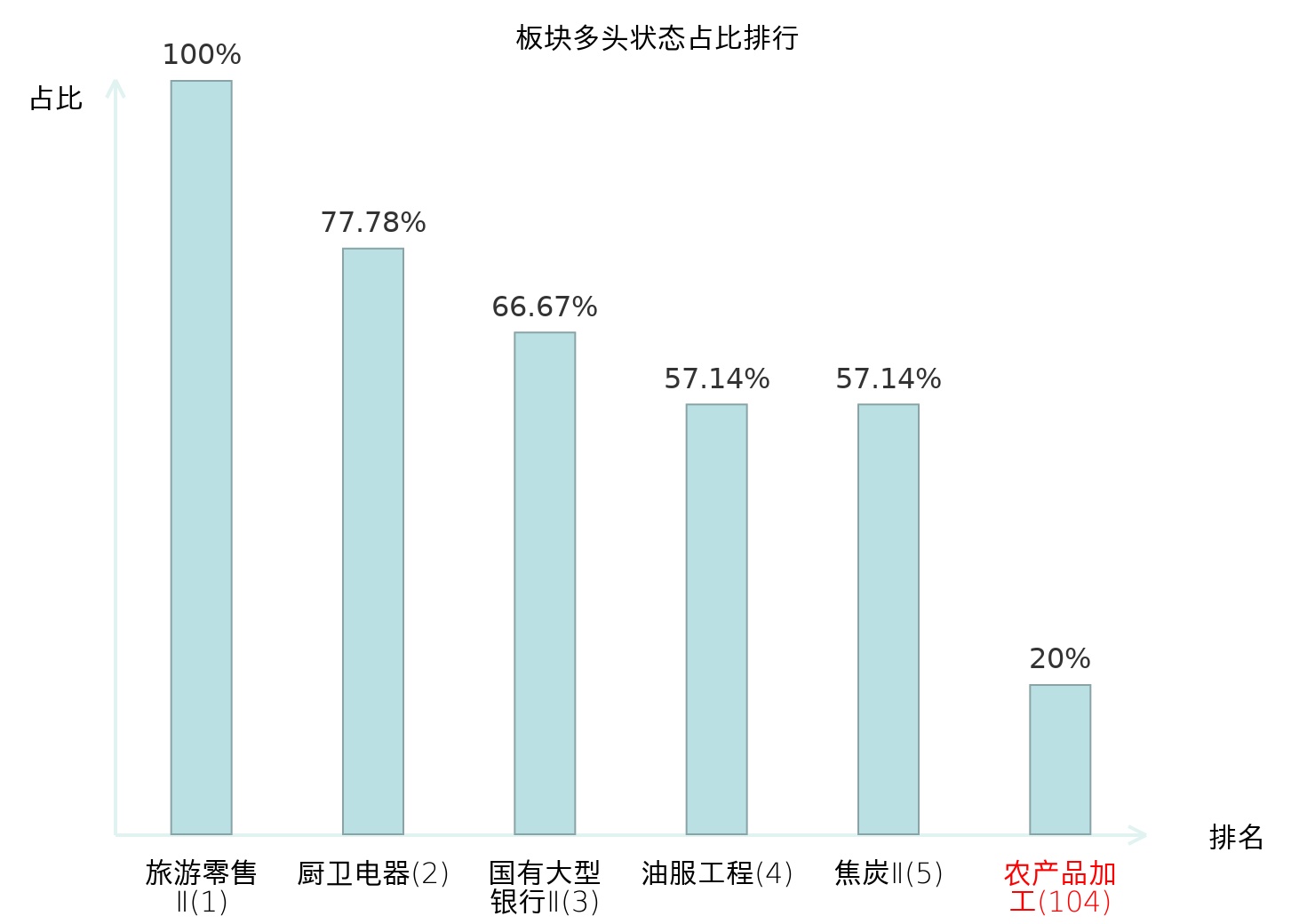 全市场所有行业板块中主力多头状态占比排名中,旅游零售Ⅱ板块位居第一。房地产服务板块名次提升最快,较昨日上升71位。