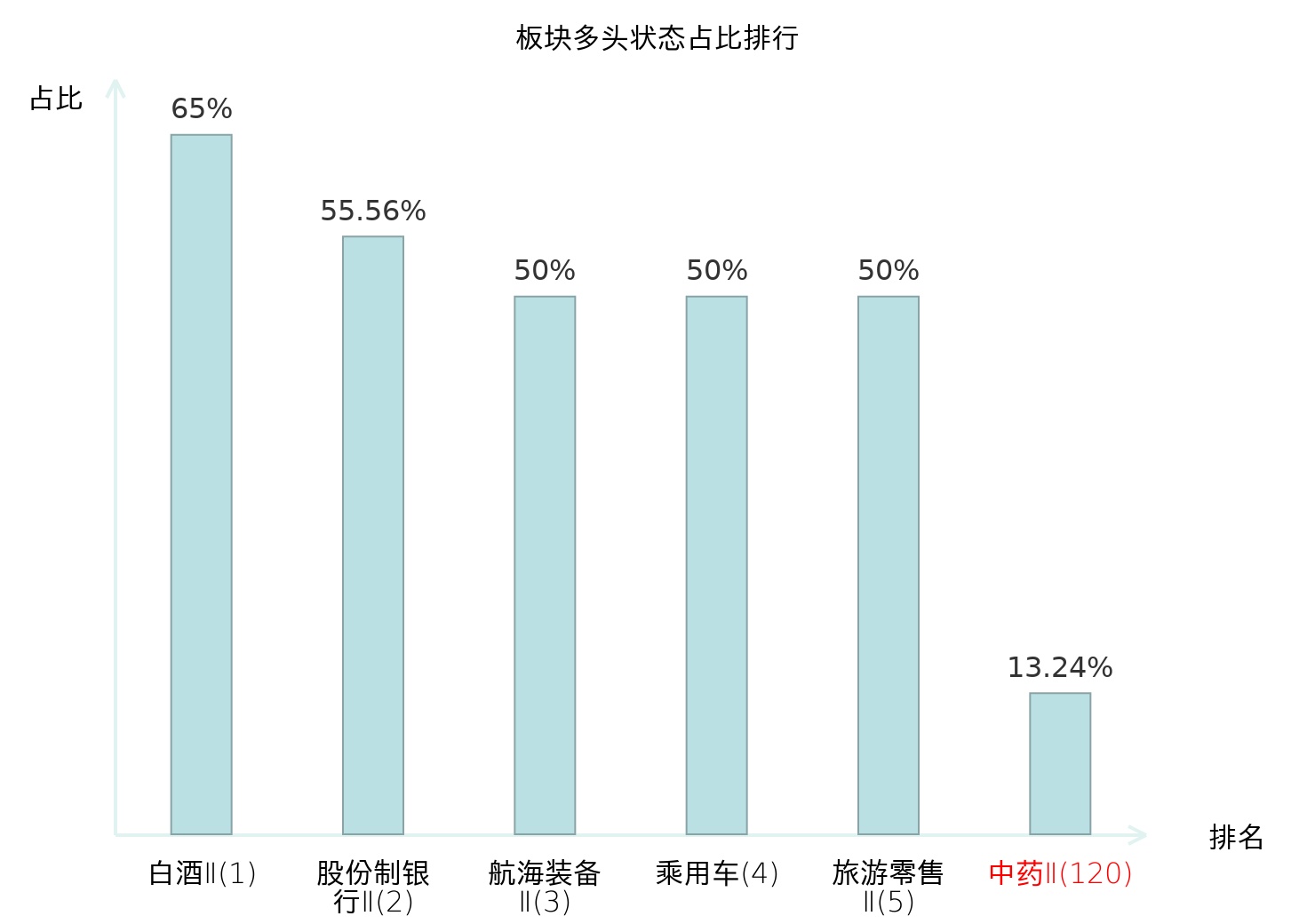 全市场所有行业板块中主力多头状态占比排名中,白酒Ⅱ板块位居第一。其他家电Ⅱ板块名次提升最快,较昨日上升93位。