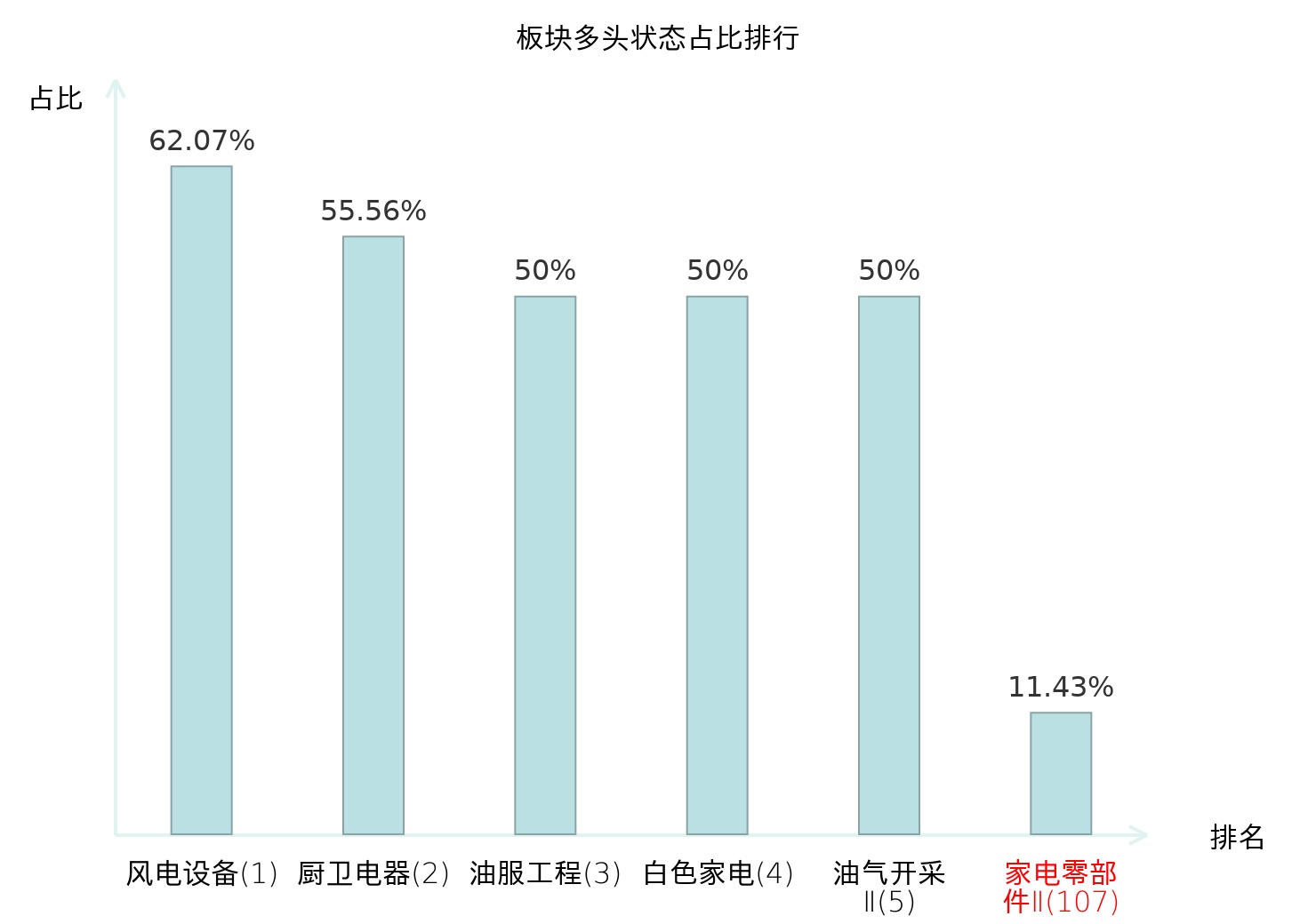 全市场所有行业板块中主力多头状态占比排名中,风电设备板块位居第一。专业连锁Ⅱ板块名次提升最快,较昨日上升65位。