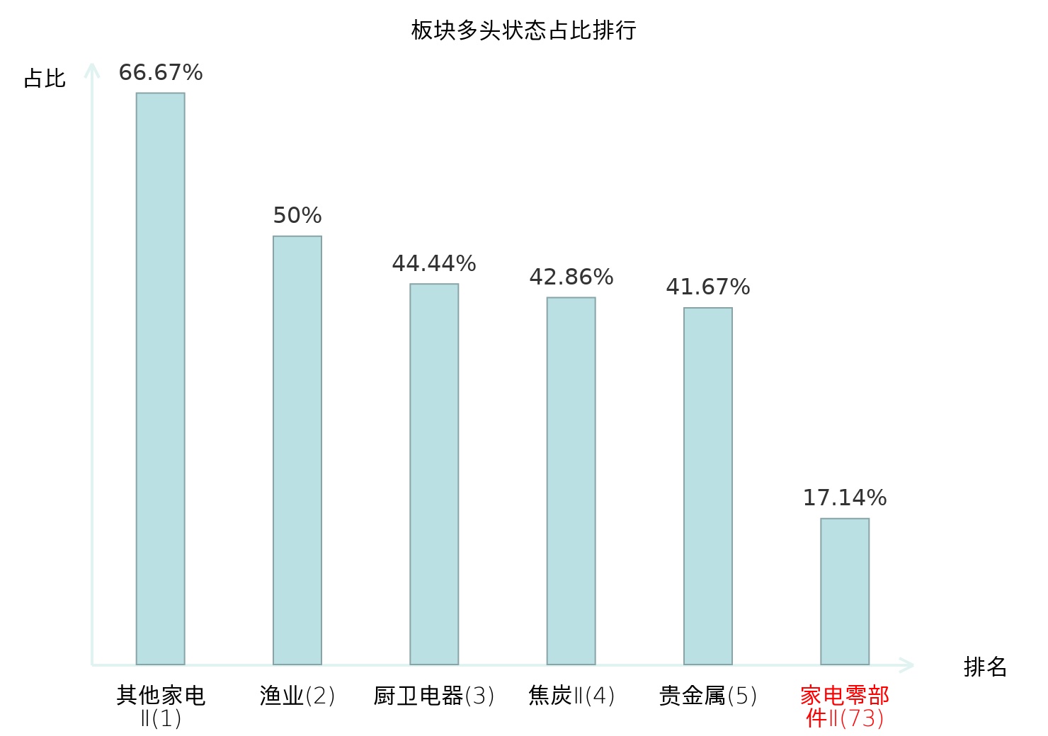 全市场所有行业板块中主力多头状态占比排名中,其他家电Ⅱ板块位居第一。乘用车板块名次提升最快,较昨日上升82位。