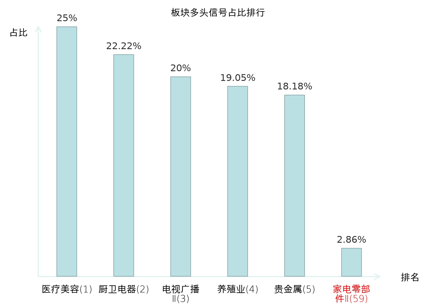 全市场所有行业板块中主力多头信号占比排名中,医疗美容板块位居第一。医疗美容板块名次提升最快,较昨日上升126位。