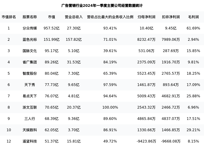 遥望科技最新报告期数据为一季度,下表汇总了广告营销行业内市值靠前的公司一季度主要经营数据