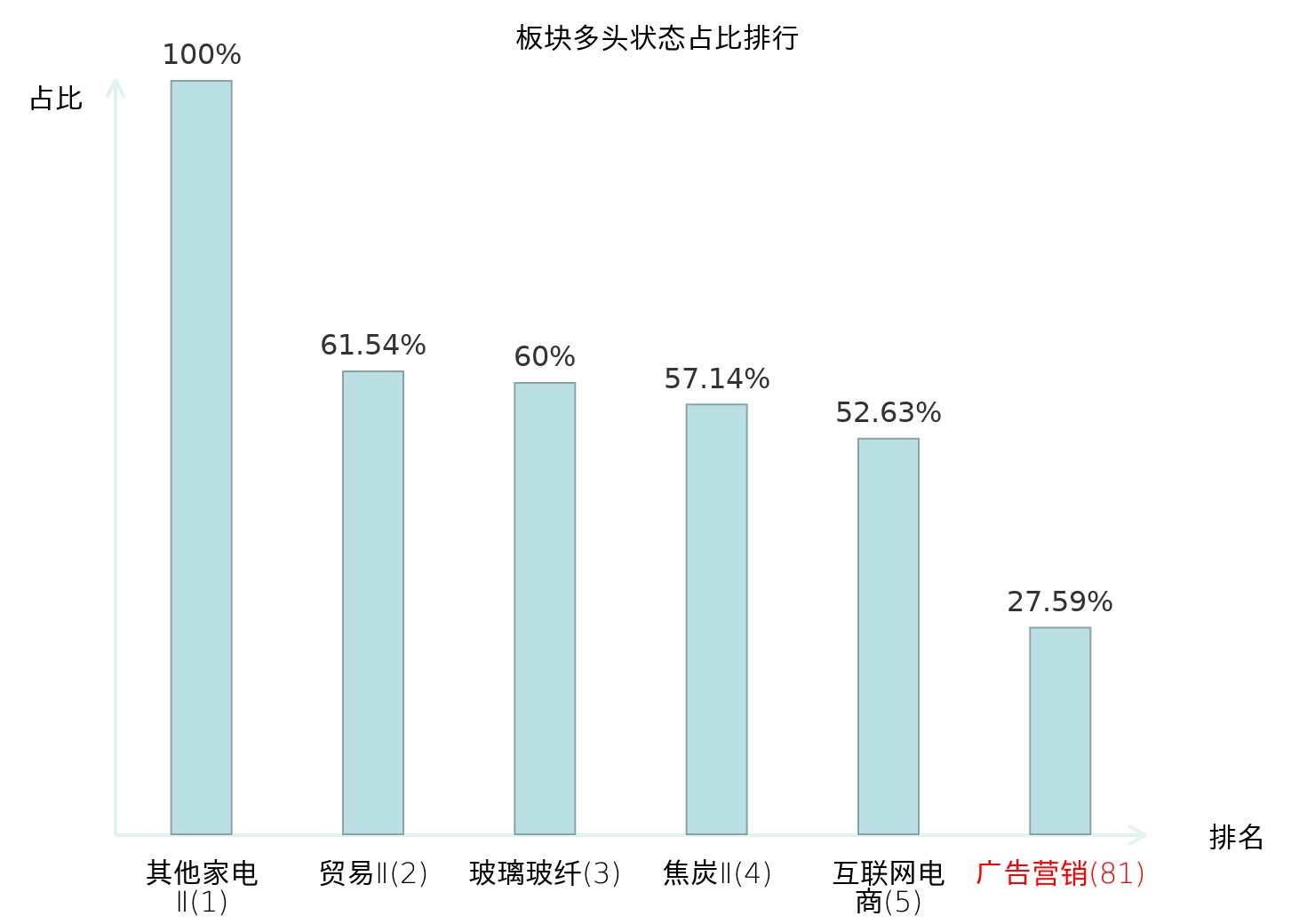 全市场所有行业板块中主力多头状态占比排名中,其他家电Ⅱ板块位居第一。教育板块名次提升最快,较昨日上升50位。
