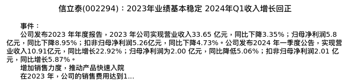 值得注意的是:2024年05月天风证券的杨松/曹文清分析师,首次发布关于信立泰的研究报告,标题为:信立泰(002294):2023年业绩基本稳定 2024年Q1收入增长回正。
