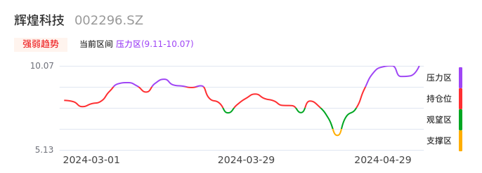 我们来看一下该股的九方特色指标强弱趋势的情况:辉煌科技自04月22日进入压力区。股价出现一波急速拉升行情,目前上升动能较为充足可继续持股。注意今日下方支撑位:10.07元。如被有效跌穿,短期可能出现强势调整。