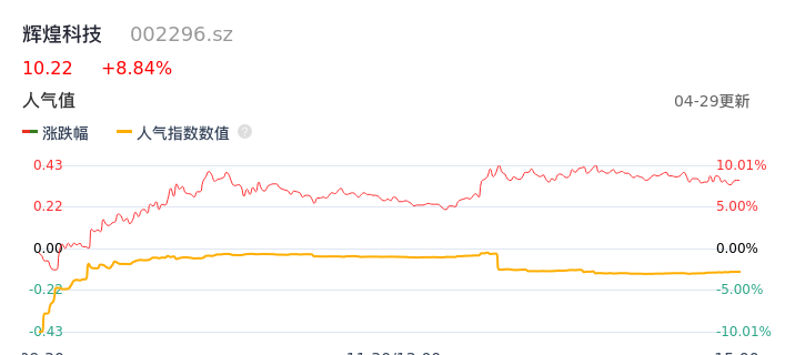 04月29日,辉煌科技收报10.22,股价涨幅8.84%,成交金额10.73亿元,换手率31.12%。