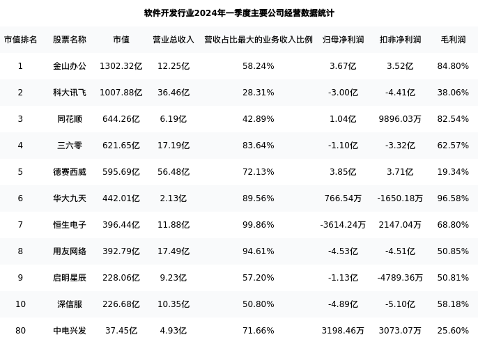 中电兴发最新报告期数据为一季度,下表汇总了软件开发行业内市值靠前的公司一季度主要经营数据