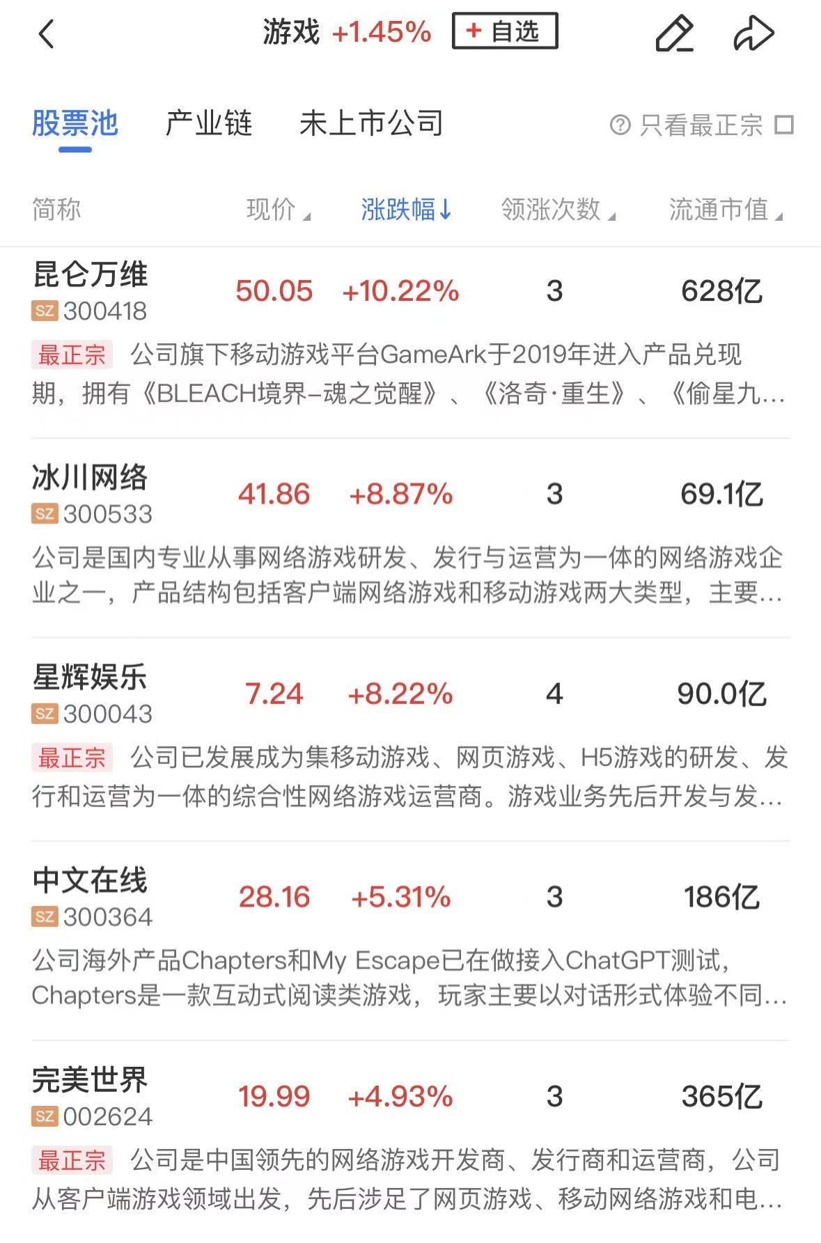 板块上,游戏板块涨幅居前,昆仑万维涨超10%,冰川网络、星辉娱乐、完美世界、盛天网络等个股涨幅居前。