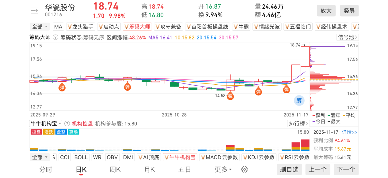 3)20251117-华瓷股份-001216-【筹码大师】和【牛牛机构宝】-近期出现弹信号且底部量柱由绿转红