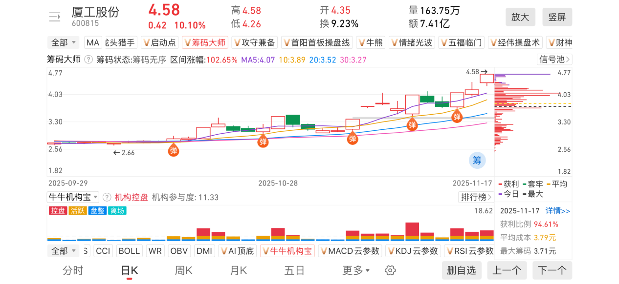 1)20251117-厦工股份-600815-【筹码大师】和【牛牛机构宝】-近期出现弹信号且底部量柱由绿转红