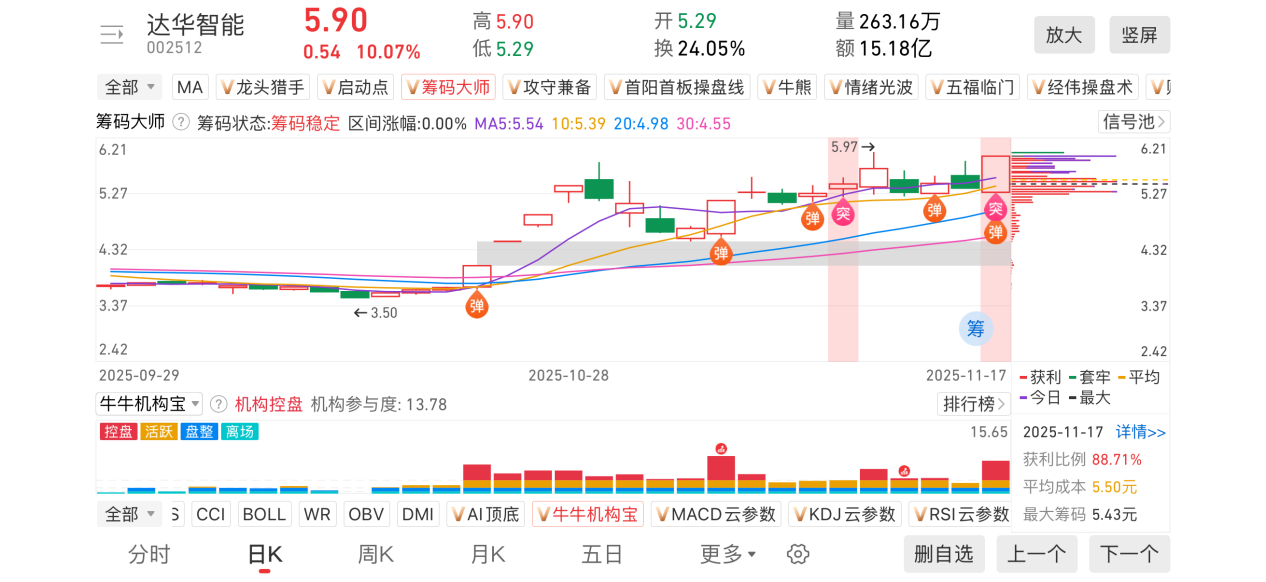 2)20251117-达华智能-002512-【筹码大师】和【牛牛机构宝】-近期出现弹信号且底部量柱由绿转红