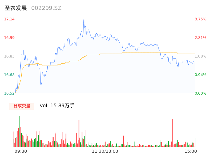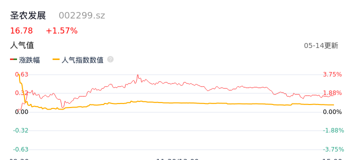 05月14日,圣农发展收报16.78,股价涨幅1.57%,成交金额2.68亿元,换手率1.30%。