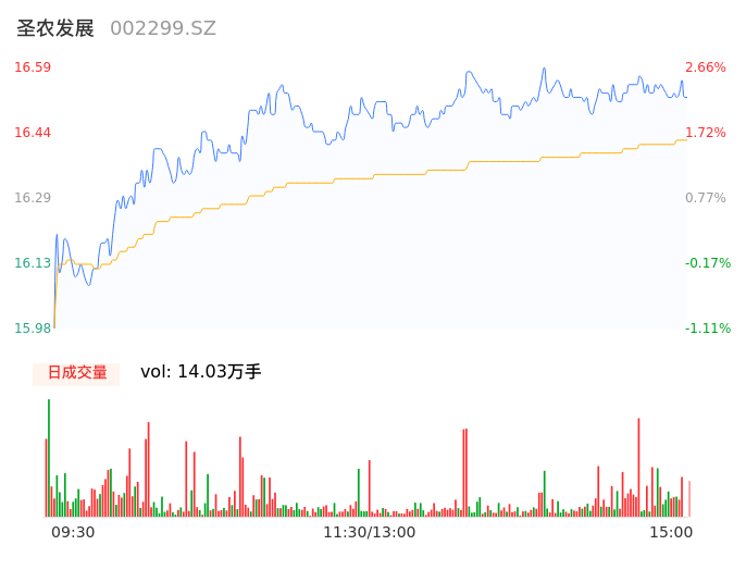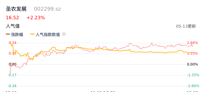 05月13日,圣农发展收报16.52,股价涨幅2.23%,成交金额2.30亿元,换手率1.14%。