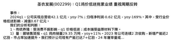 值得注意的是:2024年05月天风证券的吴立/陈潇分析师,首次发布关于圣农发展的研究报告,标题为:圣农发展(002299):Q1鸡价低迷拖累业绩 重视周期反转。
