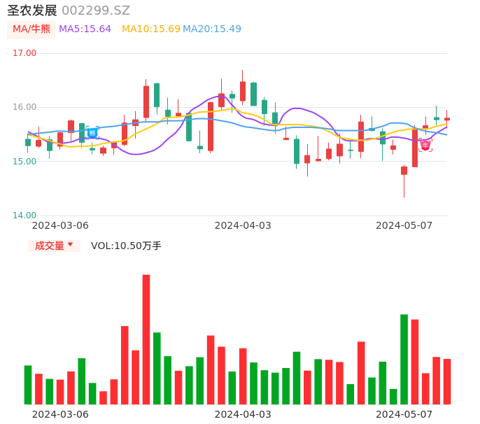 05月07日,圣农发展收报15.80,股价涨幅0.19%,成交金额1.65亿元,换手率0.86%。
