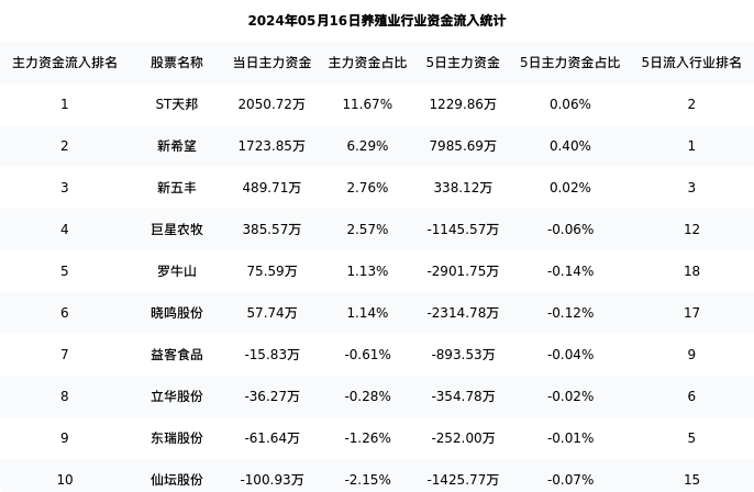 从主力资金流向来看,养殖业行业今日主力资金流入10.56亿元,在所有申万二级行业中排名:4/131。