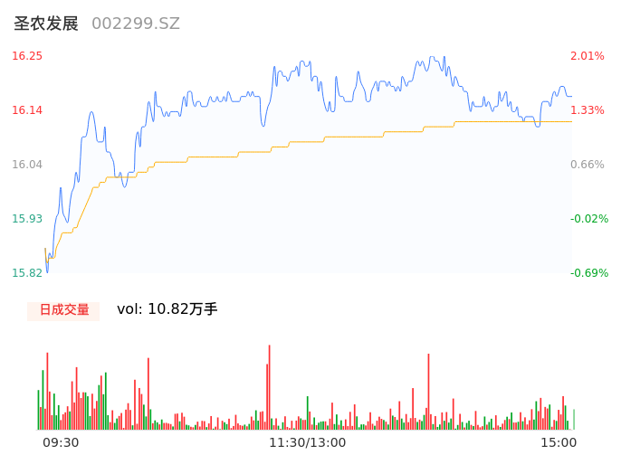 05月09日,圣农发展收报16.16,股价涨幅1.44%,成交金额1.74亿元,换手率0.88%。