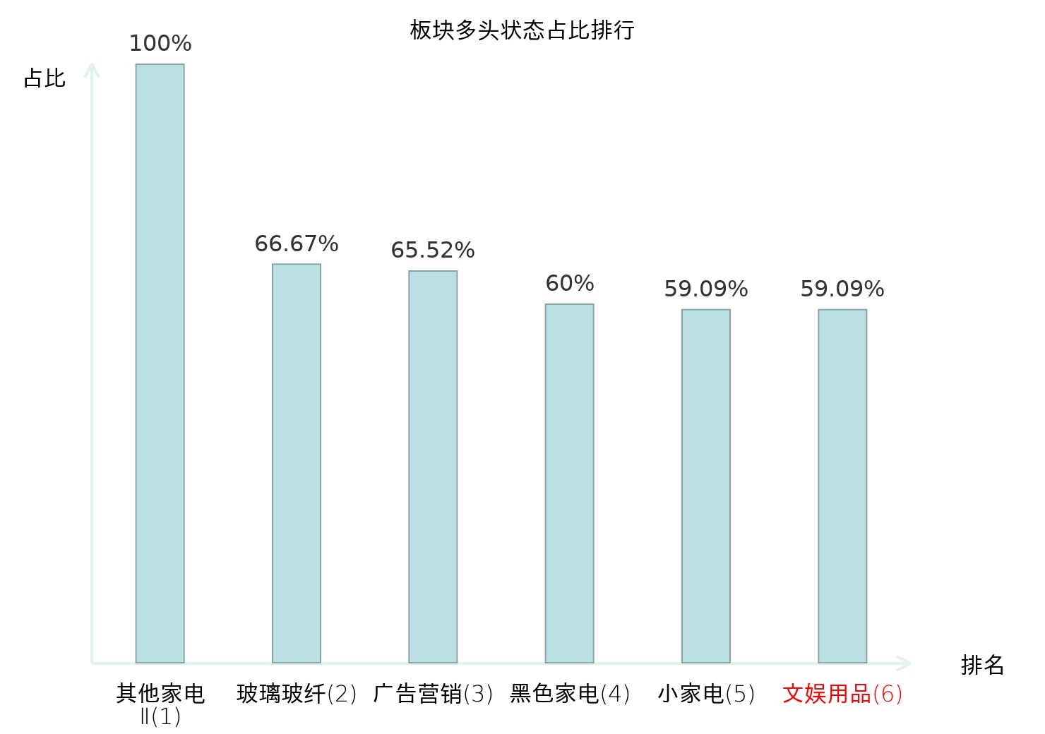 全市场所有行业板块中主力多头状态占比排名中,其他家电Ⅱ板块位居第一。航天装备Ⅱ板块名次提升最快,较昨日上升79位。