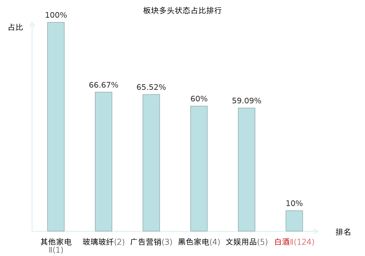 全市场所有行业板块中主力多头状态占比排名中,其他家电Ⅱ板块位居第一。体育Ⅱ板块名次提升最快,较昨日上升57位。