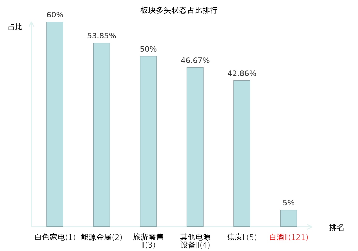 全市场所有行业板块中主力多头状态占比排名中,白色家电板块位居第一。油服工程板块名次提升最快,较昨日上升87位。