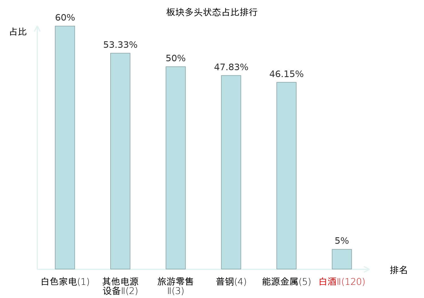 全市场所有行业板块中主力多头状态占比排名中,白色家电板块位居第一。照明设备Ⅱ板块名次提升最快,较昨日上升55位。