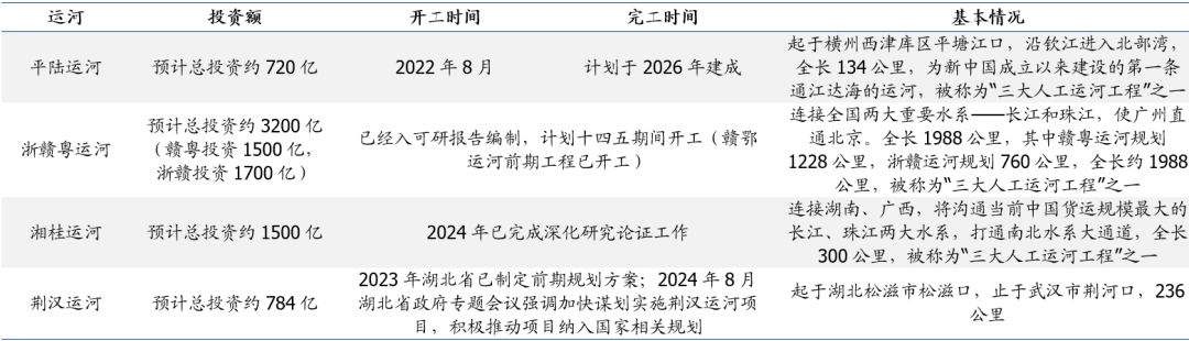 2)大型运河项目:运河是现代物流重要组成部分,有利于推动运输行业降本增效(其成本是铁路运输成本的1/2,公路运输成本的1/5,航空运输成本的1/20)、改善区域产业布局、拉动内陆经济发展,具备重大国家战略意义。启动部分重大运河项目短期可起到稳投资、稳经济的重要作用(据交通部,估算沿海和内河水运建设投资乘数为1∶6和1∶3左右)。我国天然的河流超5800条,总长超过43万km,具有优越的内河资源,当前已有多条运河项目在建或筹建中。2024年8月初,新中国成立以来建设的第一条通江达海的运河——平陆运河建设任务实现“双过半”,项目总投资约720亿元,累计完成投资368亿元,项目2022年开建,预计将于2026年完成,通航后中国西南地区可直接自西江干流向南入海,预计缩短入海航程约560公里,每年为西部陆海新通道沿线地区节约的运输费用超52亿元。