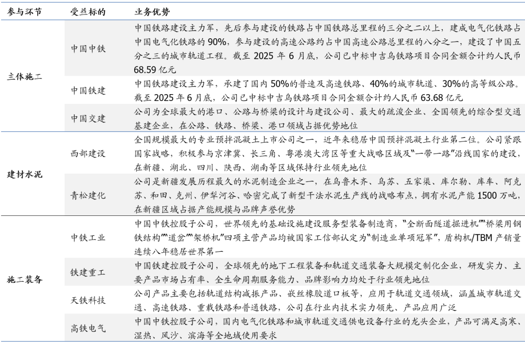 重大铁路及交通项目建设启动带动施工、建材、装备等需求释放:1)主体施工环节重点推荐大型铁路及交通建设龙头央企中国中铁、中国铁建、中国交建等;2)建材水泥环节重点关注新疆水泥龙头青松建化、预拌混凝土龙头西部建设等;3)施工装备环节重点关注大型盾构机/TBM龙头中铁工业(中国中铁子公司)、铁建重工(中国铁建子公司)、铁轨减震龙头天铁科技、轨交供电设备龙头高铁电气(中国中铁子公司)。