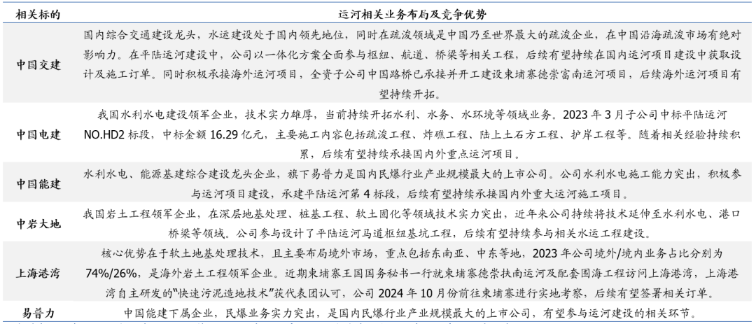 同时,我国还在筹建多个运河项目,包括:1)浙赣粤运河:由赣粤、浙赣运河组成,总投资约3200亿元,建成后将连通京津冀、长三角、粤港澳大湾区三大国家战略区域,全长约1988公里,超过目前世界最长的京杭大运河。2)湘桂运河:总投资约1500亿元,将连接长江、珠江两大水系,打通南北水运大通道,实现全国36个内河主要港口中的34个互联互通。3)荆汉运河:总投资约784亿元,将打通长江中游的“肠梗阻”段,截弯取直。上述运河项目合计规模达6204亿,是2023年我国内河建设投资的5.9倍,如果后续分批陆续启动建设,有望对投资形成较强支撑。此外,伴随“一带一路”战略持续推进,海外运河建设机会众多,我国基建企业在海外运河建设中持续发挥技术、施工、管理等优势,后续有望持续承接海外运河建设项目。涉及运河建设的建筑细分方向及重点标的包括:1)水利交通施工、疏浚龙头中国交建(一体化方案全面参与平陆运河建设,参与境外柬埔寨运河建设);2)水利施工龙头中国电建、中国能建(均参与平陆运河部分标段建设);3)岩土工程龙头中岩大地(参与平陆运河马道枢纽基坑工程)、海外地基工程龙头上海港湾;4)民爆龙头易普力等。