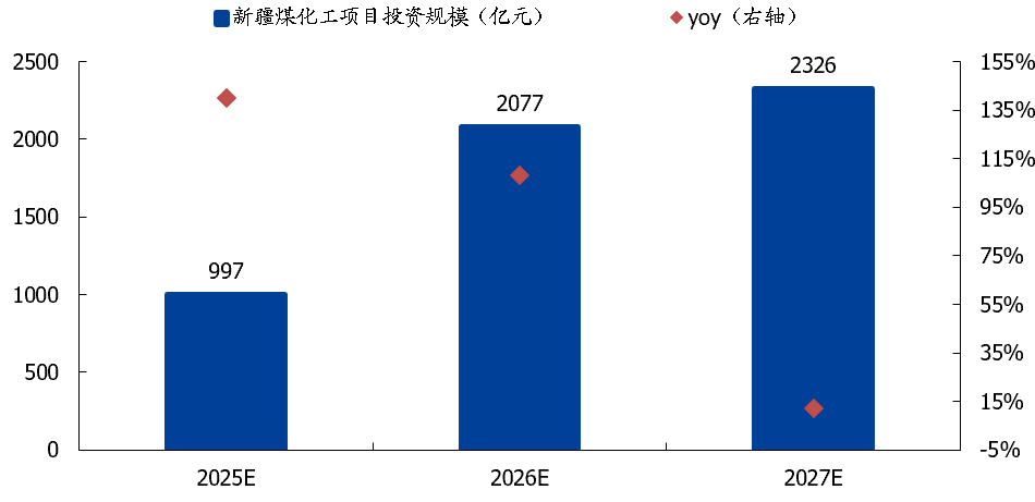 根据公开信息不完全统计,截至2025年6月,新疆在建及拟建煤化工项目投资总额超8000亿元。从项目类型上看,煤制油/煤制气/煤制烯烃项目规划投资额分别约1910/2208/1426亿元,占比分别为23%/27%/17%。从项目进度看,已开工(以土建动工为节点)项目规划投资总额近2400亿元(2025年新开工约713亿元),占比约28%,另有多个项目前期筹备工作稳步推进,2025年年内有望正式启动。从项目投资节奏上看,测算2025-2027年每年投资额约为997/2077/2326亿元,2025年有望开启较大规模EPC招标,2026年开始项目建设预计显著提速,工程企业收入、利润有望加速转化。重点推荐煤化工EPC龙头中国化学、东华科技、三维化学,以及新疆本地基建龙头新疆交建、北新路桥,水泥龙头青松建化等。